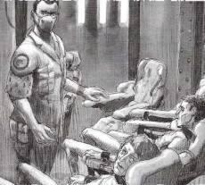 Dans cette salle, un petit générateur très onéreux dans un coin permet d'éclairer celle-ci, et est aussi relié à un mur rempli de matos informatique très couteux et en partie démonté. L'odeur de la salle est pire que tout : excréments, vomissures, sueur et nécrose. Au centre de la salle, six sièges, dont certains sont occupés par des corps entièrement nus. Les sièges sont des fauteuils de dentiste, et les corps sont entravés par des liens. Ils ont sous perfusion, le crâne à vif relié par des câbles aux ordinateurs. Les connections ont été faites sans anesthésie, et sont morts depuis moins d'une heure. Trois garçons, une fille, entre 16 et 24 ans, un des garçons est asiatique, le reste est caucasien. Ils sont tous d'une maigreur hallucinante. D'après les traces, la maigreur et les escarres, ils sont attachés ainsi depuis plusieurs semaines, voire plusieurs mois. Les yeux sont rougis, les dents cassées et leur mâchoire bloquée pour qu'ils n'étouffent pas et ne se tuent pas en claquant des dents. Un tuyau a été placé pour pomper leur salive. Les selles sont évacuées par des sondes mal ajustées et infectées. Deux autres fauteuils sont vides mais ont été utilisés. Des traces montrent qu'une personne s'est arraché à ses sangles et s'est trainée jusqu'à une pièce voisine. Il a perdu du sang en s'échappant de ses greffes.